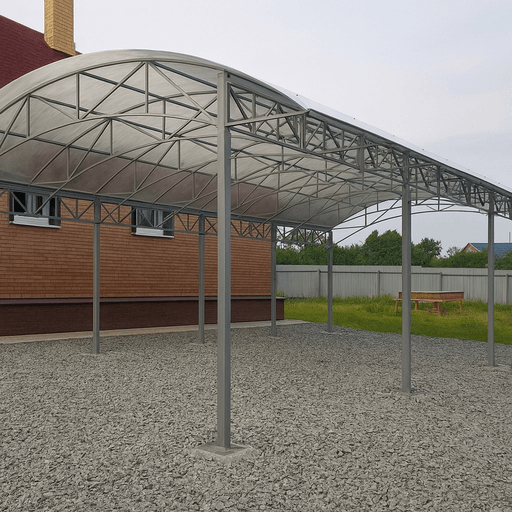 Чем больше площадь перекрытия, тем выше расход материалов и трудозатраты. Для небольших навесов можно использовать облегчённые решения, тогда как для больших потребуются усиленные опоры и фермы.