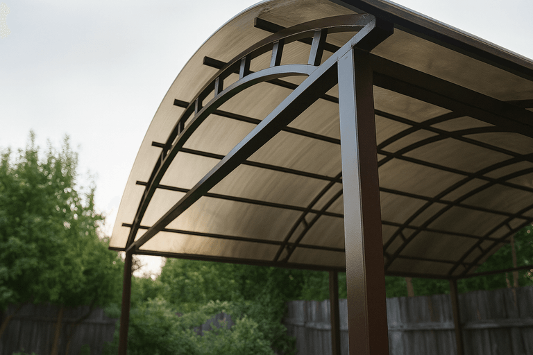 Изготовить навес из профильной трубы можно в короткие сроки — технология позволяет точно рассчитать нагрузки и обеспечить надежность конструкции. Такие навесы подходят для маленьких участков и больших парковочных зон.